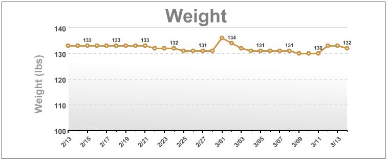 Even though I'm more focused on the way by body looks and my percent body fat versus the actual number on the scale, for the past few weeks my weight has been bouncing around the low 130's and its been driving me crazy. As you can see, my weight loss chart is just one big zigzag.